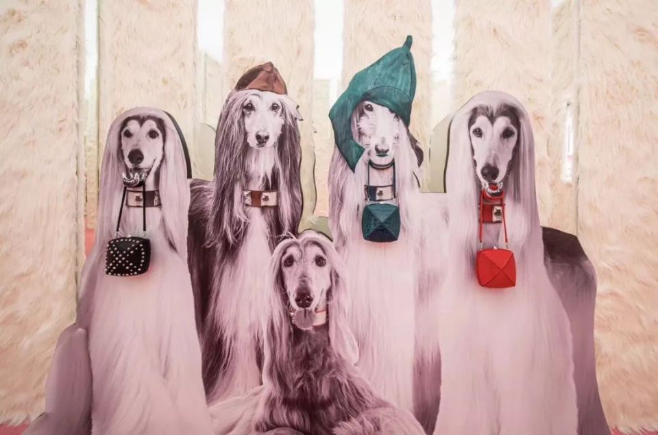 有个房间铺满粉红色的地毯,四周的墙壁上包裹着白色的毛绒元素,俨然一个柔软浪漫的宠物世界,立即吸引了小U。原来来到了Clou Médor包包房间,设计师将狗狗项圈这款样式特别的铆钉应用在Clou Médor上,包包造型漂亮迷人又娇小可爱。