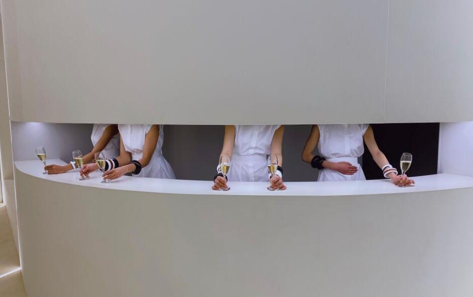 场馆内,6面无缝投影还原真实的海上场景,小U在轮渡的甲板上,随着重力起伏,宛如跷跷板。两侧矗立着4个灯柱,陈列着稀有的Roulis包包。