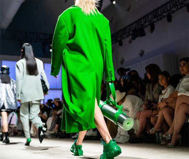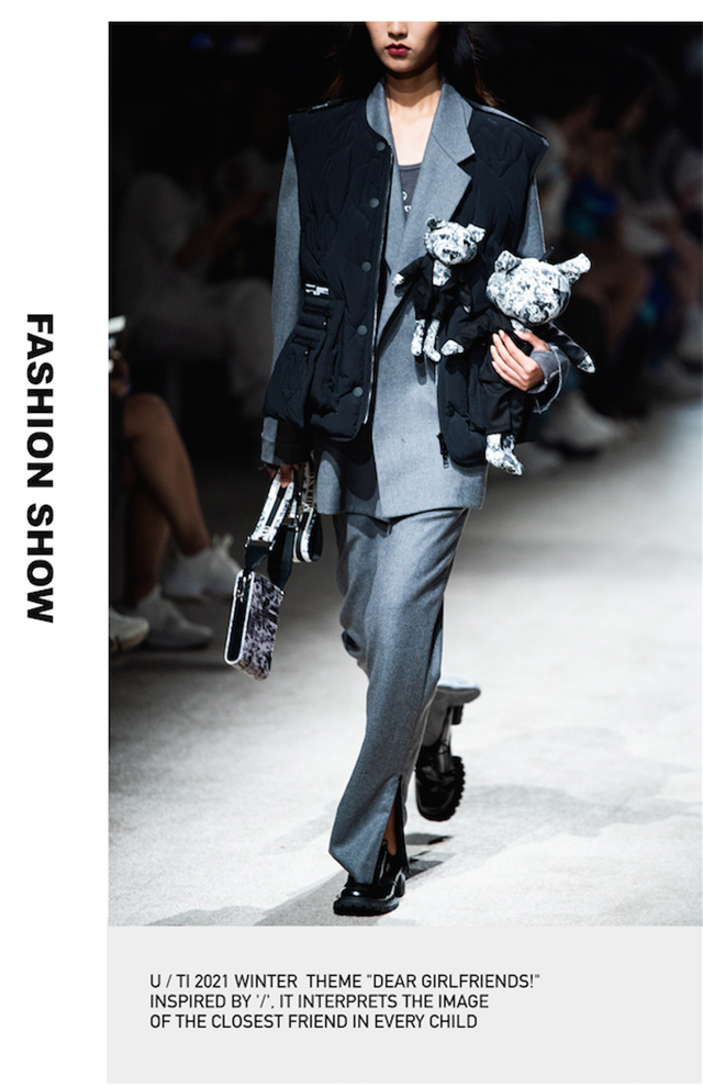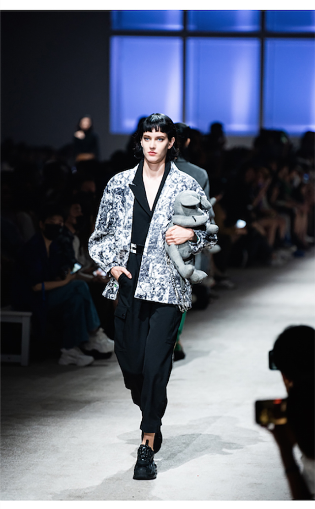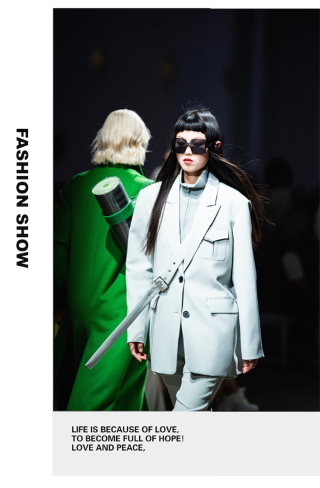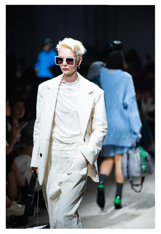 大秀开启,秀场主背景区通过半透明的薄幕达到多个角度的分割空间,同时屏幕后方透光出人影的变化。模特从屏幕后走向秀道,时尚酷感的外表下,透露的细枝末节,产生许多趣味与变化的设计,让人猜测身份下的其他多重身份。