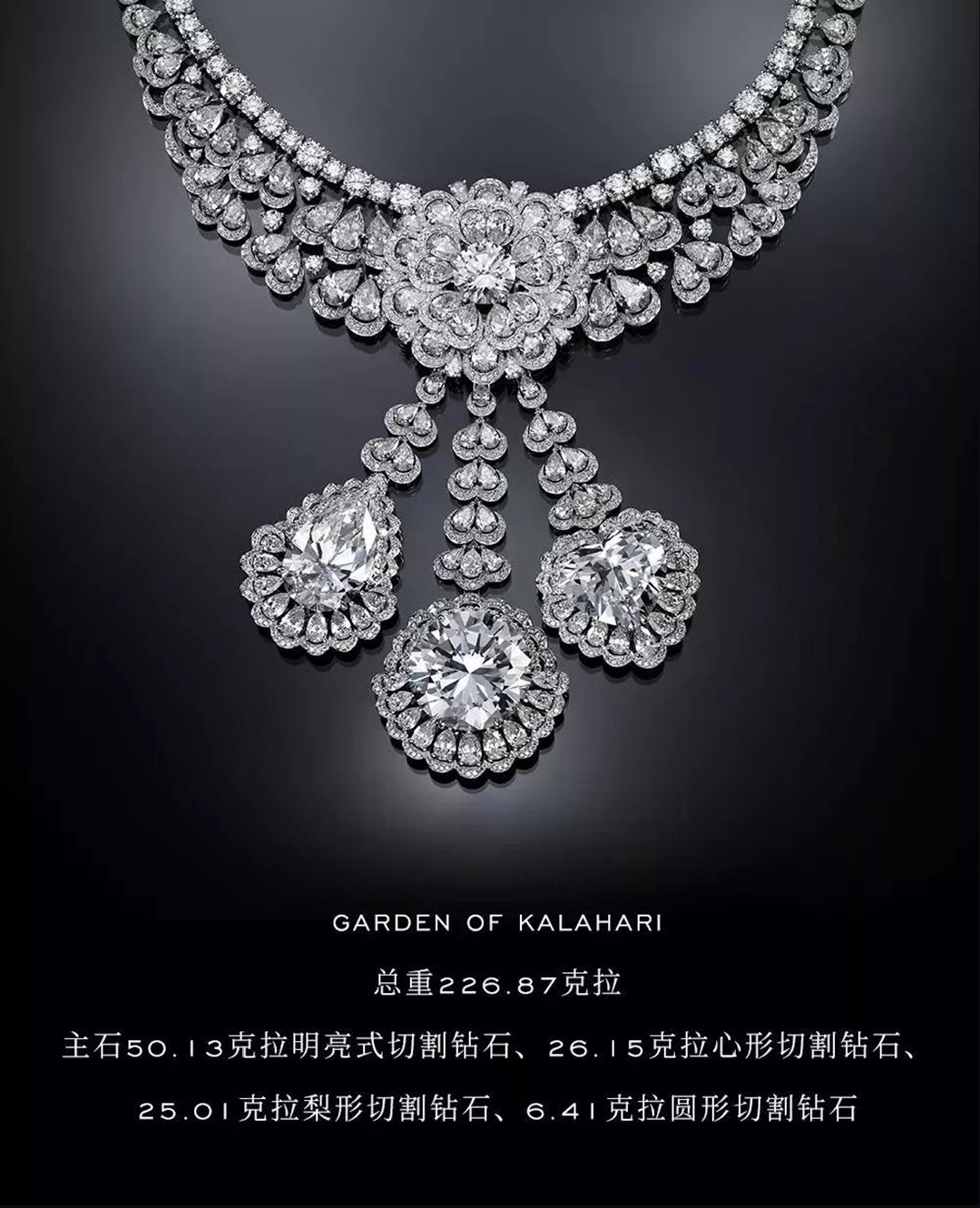 值得一提的是,此次展出的高级珠宝作品还包括惊世绝伦的喀拉哈里花园(Garden of Kalahari)系列,取材自一颗重达342克拉的D色无瑕钻石,在“Desert Horizon”展厅展出,带领宾客探寻发现珍罕宝石的奇妙秘境。