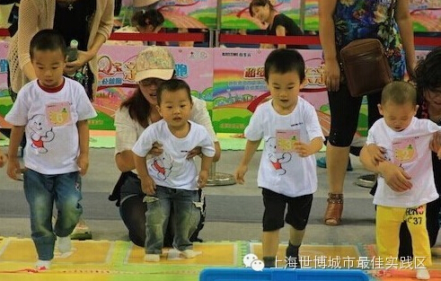 在活动PQ区内,举行的正是宝贝们的跑步比赛。这或许是宝贝们人生中参加的第一次“马拉松”。他们按月龄被分成三个组别:8-12个月的宝贝参与“亲亲爬更快”7米爬行比赛;1-2岁的宝贝参与“亲亲走起来”7米大脚踩小脚走路比赛;2-4岁的宝贝,参与“亲亲一起冲”7米障碍跨越赛。宝贝们虽然脚步蹒跚,但却是尽了全力,爸爸妈妈们则在一旁鼓劲加油。