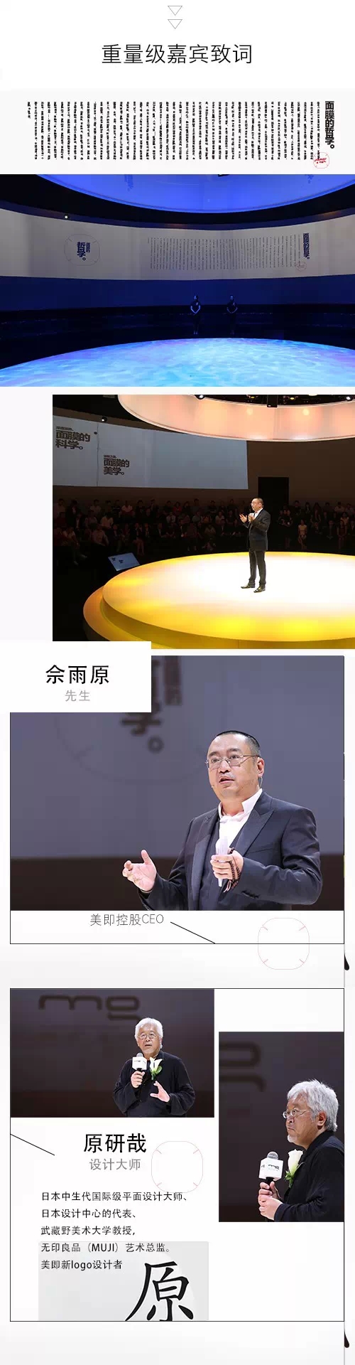 面膜的哲学,是美即柔软价值观与深厚的人文情怀的体验,也是美即对于美学的独到理解。朦胧的天水一色间,整个会场为深邃的禅意所包裹,来自日本的世界美学大师原研哉先生登台亮相,诠释简约、原生之美。