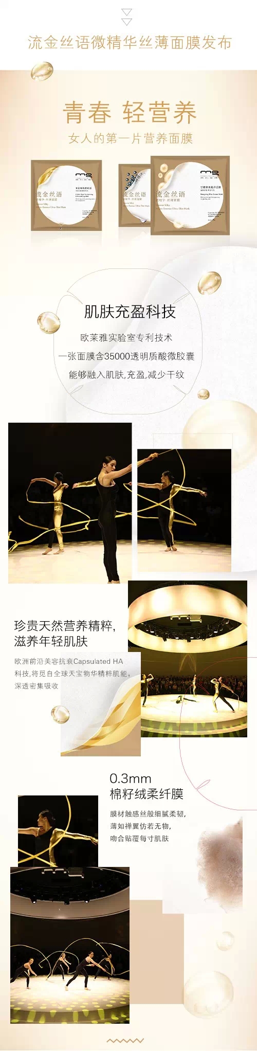 5月18日,一场以“面膜的哲学”为主题的发布会在城市最佳实践区世博创意秀场华丽举行,美即在发布会上推出了三大全新贴式面膜:原生润轻熟肌专用补水系列、全新缤纷系列、流金丝语微精华丝薄系列。同时也提到了一个非常重要的理念——面膜的哲学。