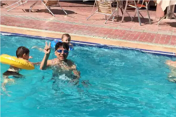傍晚的悠闲时光,队员们在酒店游泳池内休闲玩耍。