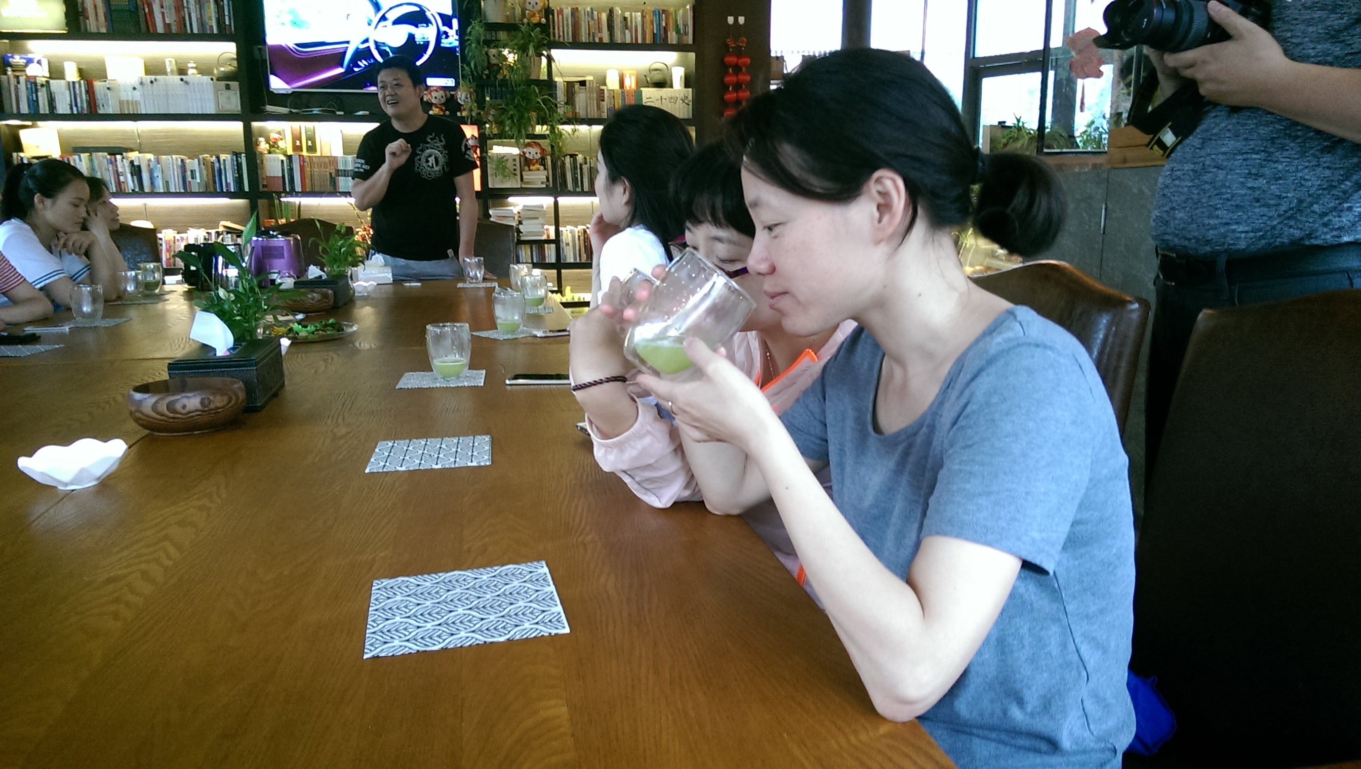 接着,老师教大家制作,将适量紫苏叶、生姜放入搅拌机,加入热水进行研磨搅拌,经过滤后,自制紫苏生姜茶完美诞生了,放入蜂蜜口味更佳哦!