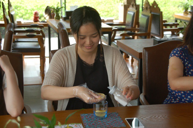 7月7日正值节气小暑,在上课前老师先教大家制作解暑利器——咸柠七:先将柠檬切片抹盐后,搁置15分钟,再加入七喜,一杯沁人心脾的咸柠七就制作完成了。