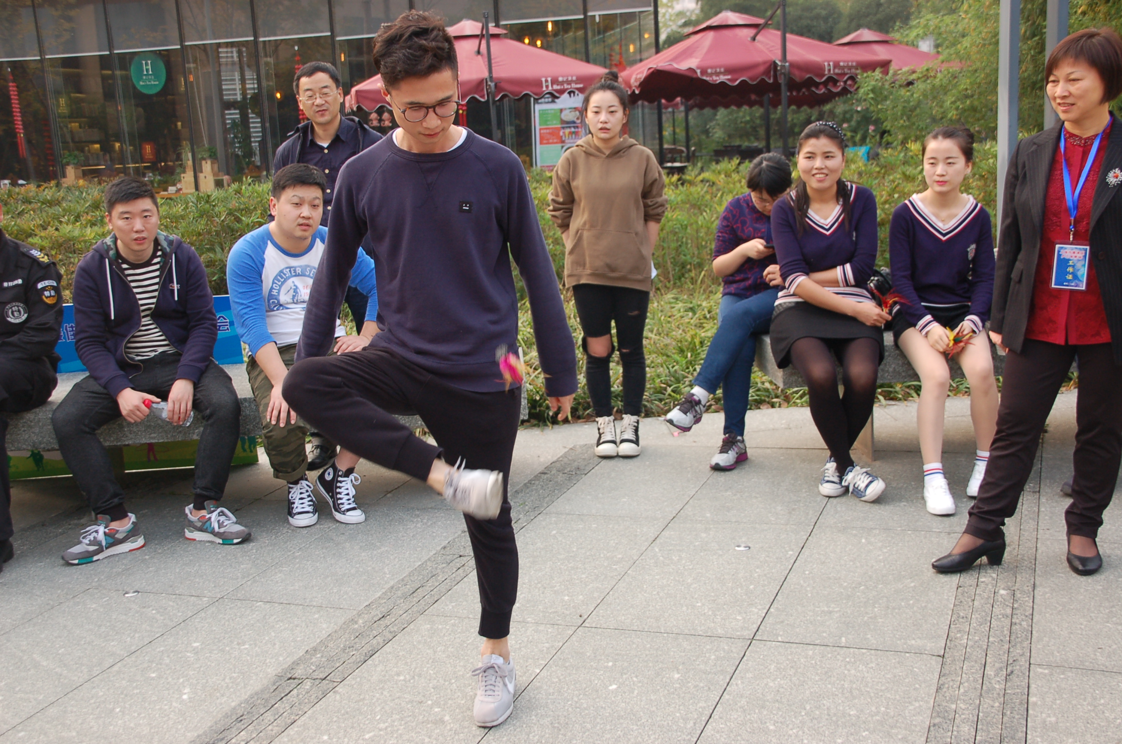 来到个人项目,大家都使出了看家本领。小U以为踢毽子是女选手的天下,可现场男选手照样踢得有模有样。相比之下,小U可就汗颜了。