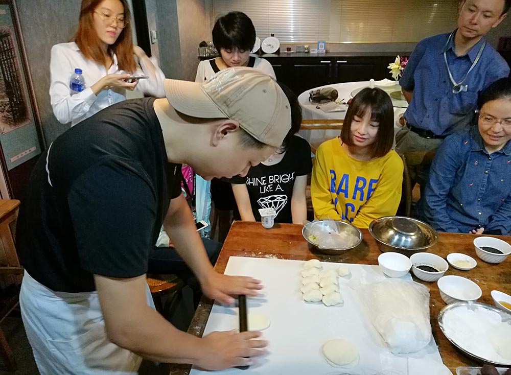 第二步,只见老师将酥油皮面团和普通面团以4:6的比例混合制作月饼饼皮,然后把饼皮反复折成三折揉捏,增强烘烤后饼皮的酥脆感,劲道的饼皮面团制作成功!