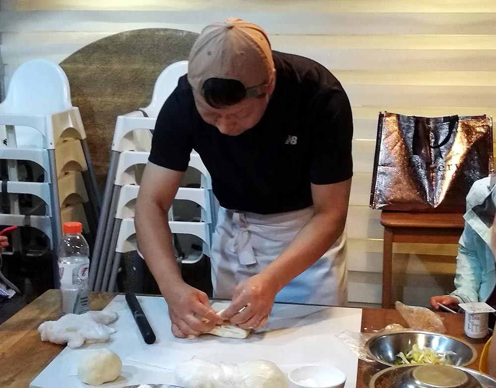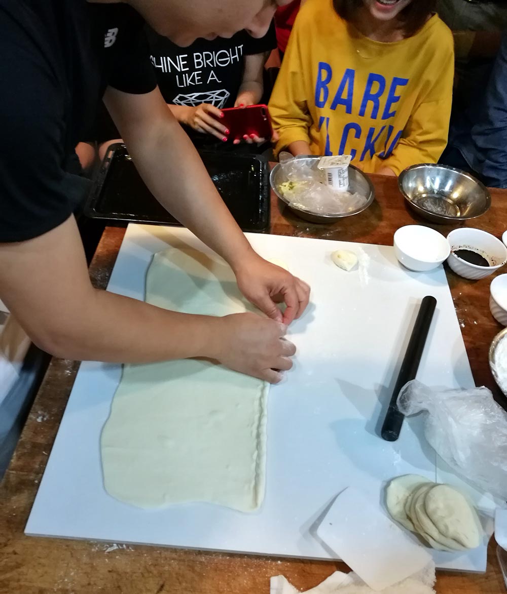 紧接着老师小心翼翼地将饼皮面团搓揉成长条,然后切成小段,别看老师人高马大,做起点心来,非常细心,力道拿捏得恰到好处。