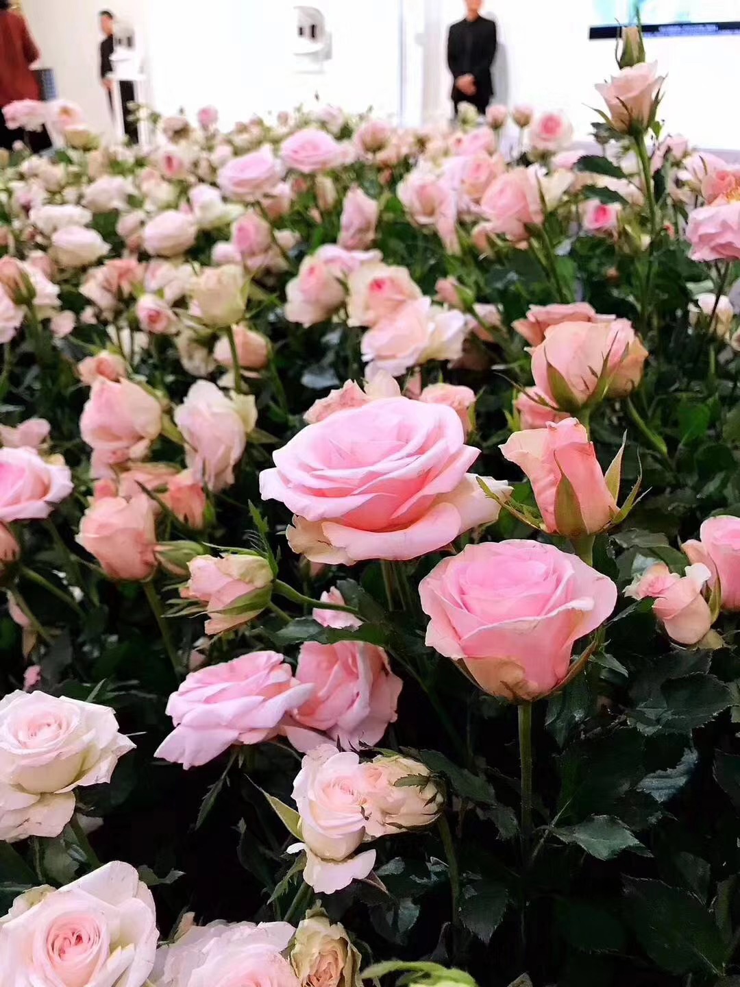 还没进入秀场,就闻见花香。从法国空运而来的格兰维尔玫瑰充斥着秀场,相拥绽放的粉色花朵娇艳欲滴,扑鼻而来的芬芳给阴雨连连的上海带来了一抹沁人心脾。