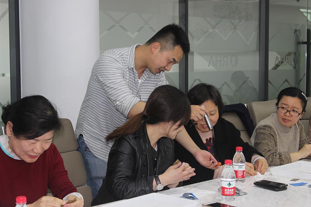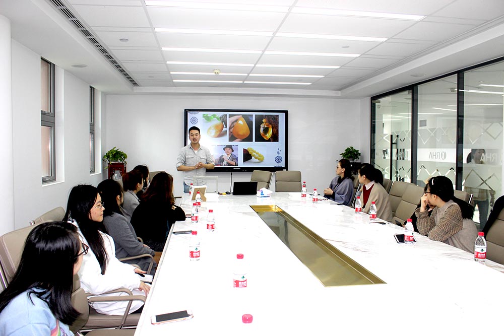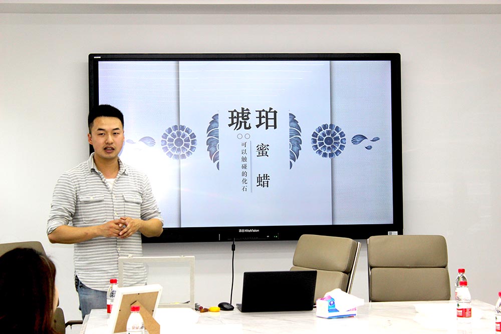 “蜜蜡属于琥珀的分支,也是天然的有机宝石,需要经过数百万上千万年才能形成。蜜蜡的颜色分类很多,有蛋清色、米色、鸡油黄,橘黄色,但是最常见的是黄油一般的颜色……”老师从蜜蜡的形成、蜜蜡文化发展讲述到蜜蜡的真伪鉴别,再到蜜蜡的打磨方法,专业细致的讲解,让小伙伴们听得入神。大家豁然开朗“哦,原来是这样啊!”。
