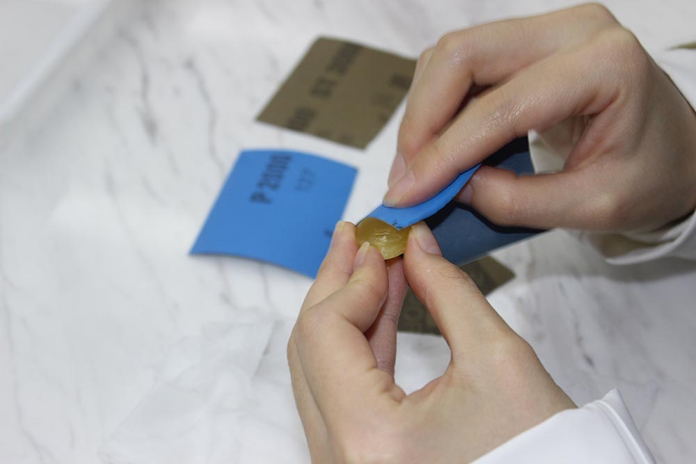 小伙伴们按照老师的指导,先将压缩小毛巾入水浸湿备用,再将蜜蜡和砂纸沾水浸湿。开始用1000目的砂纸细心地打磨起来,一边打磨一边用湿毛巾擦拭蜜蜡。大家一边抛光,一边相互交流起打磨心得。