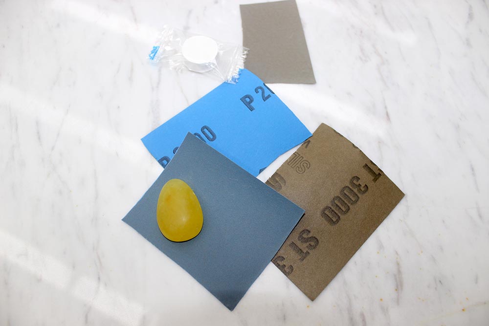 这颗蜜蜡已经用400目砂纸修正了棱角、划痕和裂纹,表面似磨砂玻璃状,单处理一颗这般大小的蜜蜡,老师就花了30分钟呢,真是细心又敬业的老师啊!