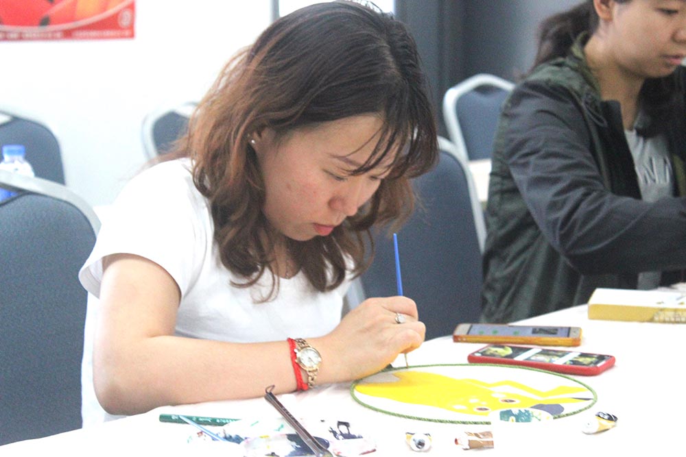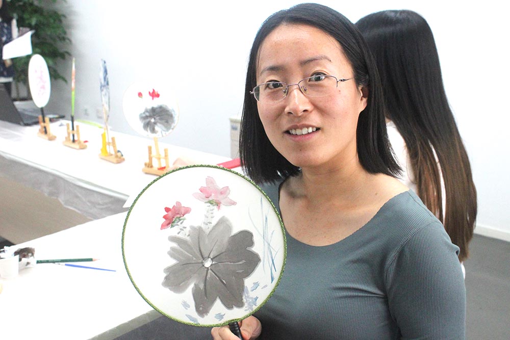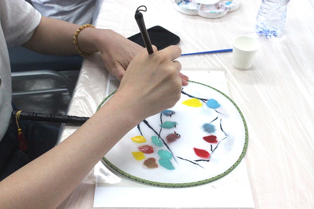 你看,男同胞也专注地沉浸在团扇绘制中,丝毫不受干扰,他的团扇图案充满了写意感,感觉好棒!