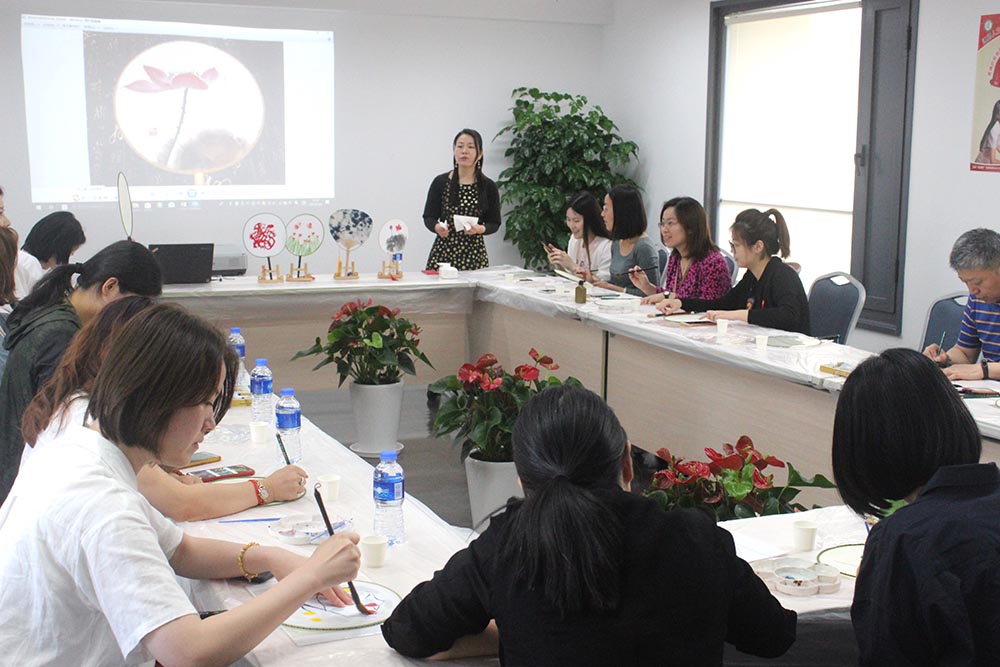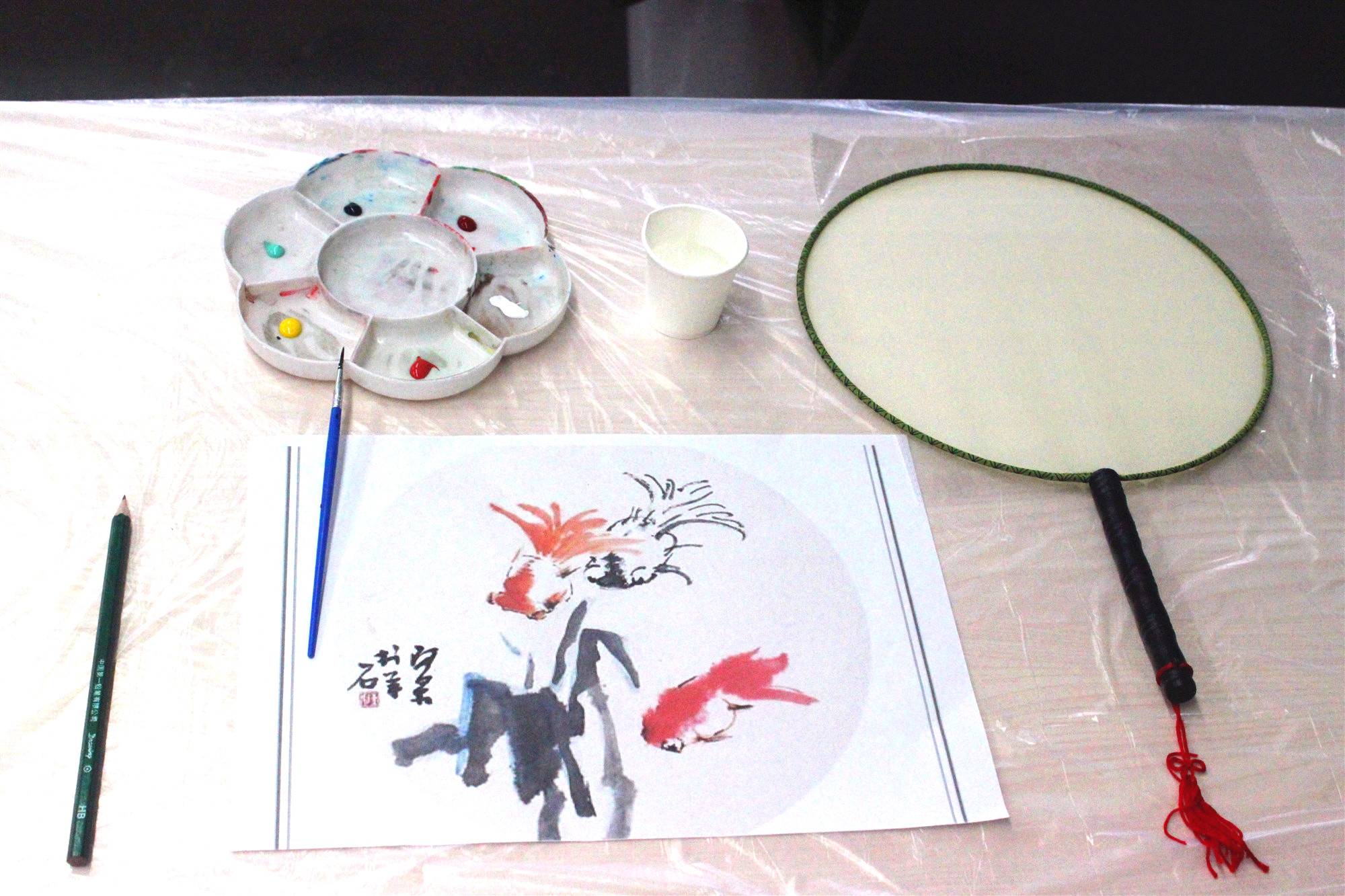 桌上为大家准备的工具和材料很简单,样稿图案、铅笔、调色盘、毛笔、清水以及团扇。要想画好可不简单哦,老师为大家重点讲解了团扇的制作方法及注意事项,例如:国画的三角构图法、团扇画面的留白、图案的构图比例、折枝法、画外引入法、毛笔执笔的方法、浓墨勾线和白色晕染等。