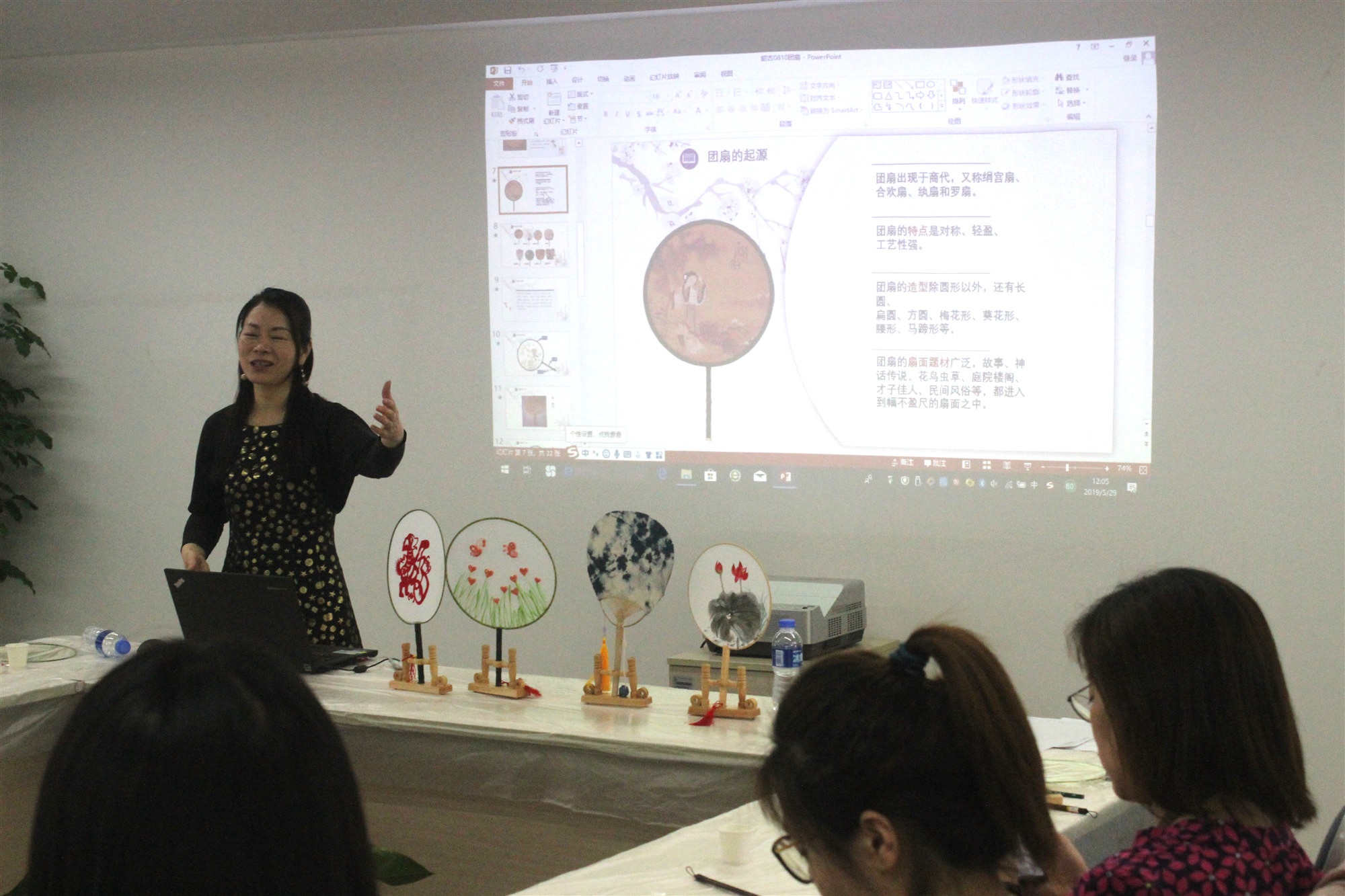 活动开始后,老师首先为大家介绍了团扇的知识。团扇又称宫扇、纨扇,起源于西汉,团扇的手柄多以木、竹、骨等材料精雕细琢制作,扇面常用的是丝、绢、绫罗之类织品以便点缀绣画。王昌龄《长信愁》诗:“奉帚平明秋殿开,且将团扇共徘徊”。