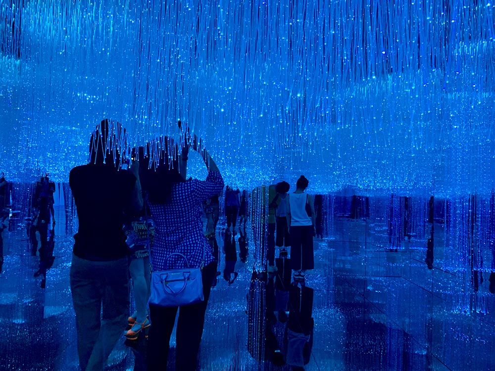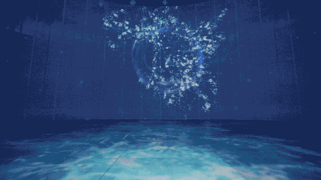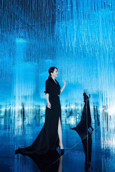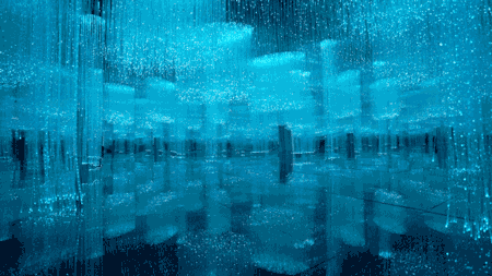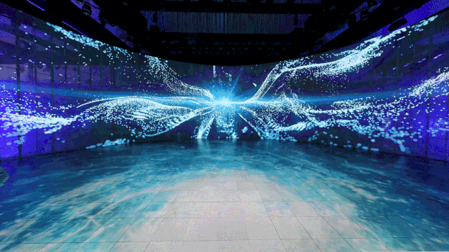 柔美的蓝色光纤、梦幻的瑰丽光影,配合地面玻璃的镜面效果,让你沉浸微生态的科技梦幻世界,如梦似幻。