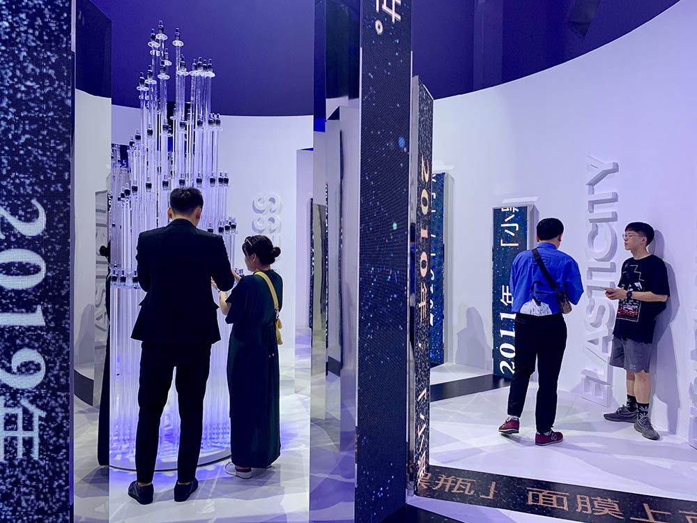 现场通过极具艺术性的方式,呈现「小黑瓶」家族的十年传奇历程。从地面延伸至空间上方的电子屏,循环播放文字,引人入胜。