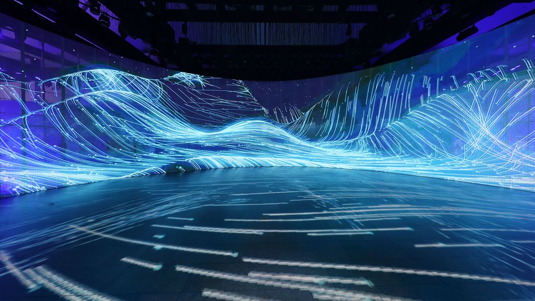 一脚踏入了「小黑瓶」内的微生态光影世界,360°环绕的巨型环屏,加以整片地屏,仿若被梦幻的微生态包围,神秘又美丽。