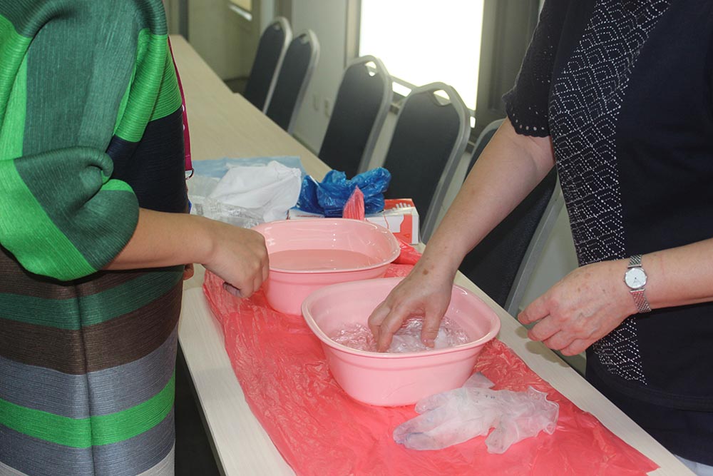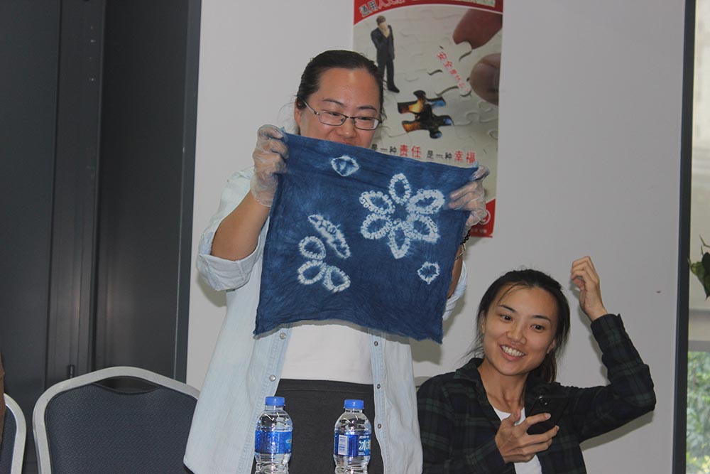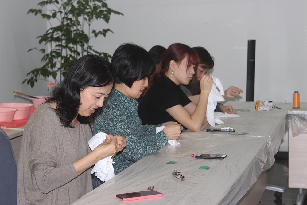 基础工作完成后,老师开始教授半成品染色。先将扎结后的胚布在清水里浸湿,拧干。接下来,将浸湿的扎结胚布浸泡到染料里10-15分钟。然后,将浸泡过染料的染布取出,拧干,静待氧化。最后,清水滤净浮色,拧干染布。老师细致的讲解和演示,白领们把每一步看在眼里,记在心里。