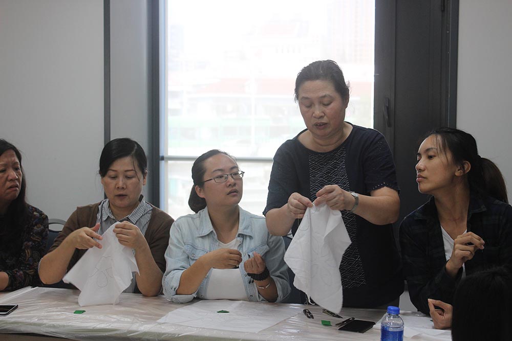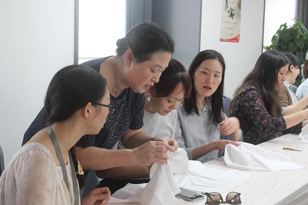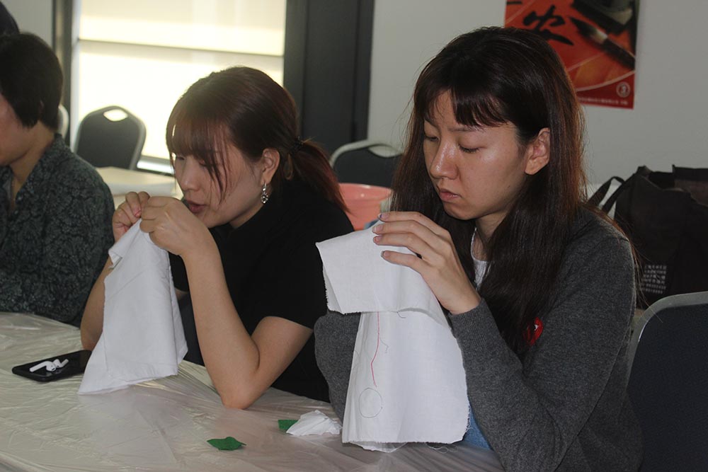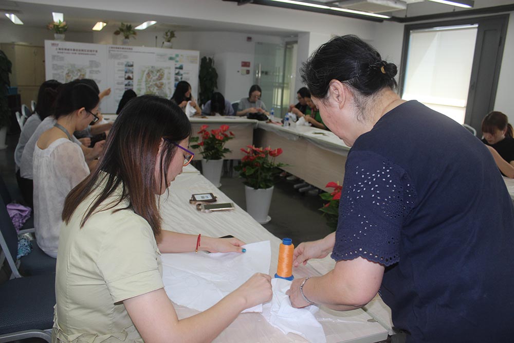 接着,老师手把手地教授扎染,沿着图案轮廓缝制抽线,缠绕扎结。老师介绍到扎染的关键在抽线,而且缝制图案要用双线,这样胚布不容易松垮,才能达到图案清晰逼真的效果。
